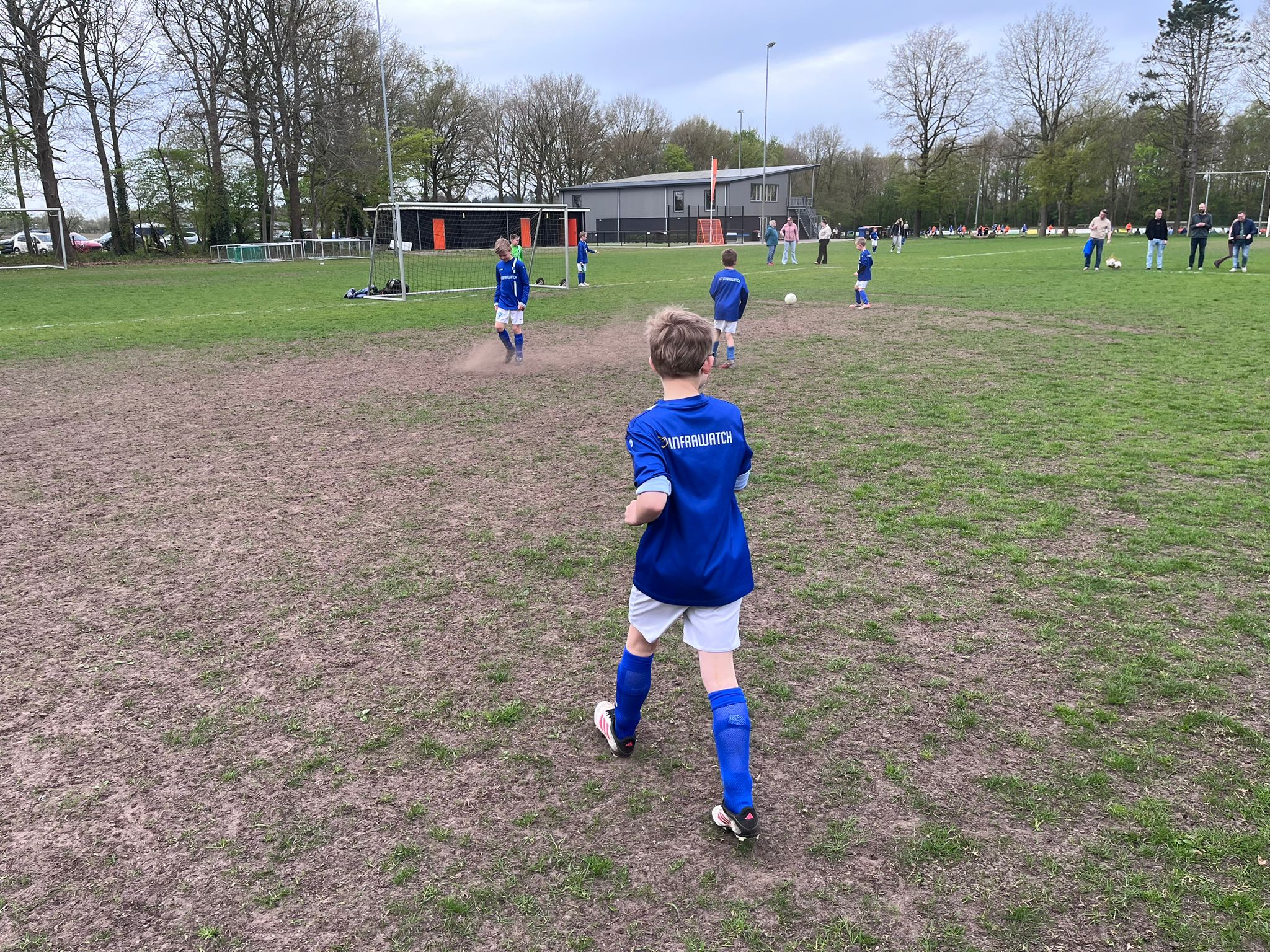 In de gemeente Ooststellingwerf lijkt het geld bij de plinten op te klotsen met 3 prachtige velden en een kantine met balkon, het kon niet op. Wij werden helaas verwezen naar een trainingsveld waar her en der nog een paar sprietjes gras stonden. (zie foto onderaan).Het maakte de jongens gelukkig niet uit want vanaf de aftrap combineerden we er op los en maakte Jesse de 0-1 na goed werk van Patrique. Haulerwijk maakte helaas snel de gelijkmaker. Tim zette ons weer op voorsprong maar voor de rust deed Haulerwijk nog wat terug. In de tweede helft ging het alle kanten op. Hoog tempo en veel strijd aan beide kanten. Rins speelde vandaag ook even op het middenveld en beloonde dat met 2 treffers. 1 uit een scherpe corner van Harm en de andere uit een matige uittrap van de keeper. Tot vlak voor tijd stonden we met 3-4 achter maar door alles of niets te spelen konden we de overwinning al ruiken. In de laatste minuut redde Sid ons nog door een magistrale sliding maar in de dying seconds sloeg het noodlot toe en werd het toch nog 5-4. Helaas heeft het voetbal niet gewonnen van de individuele momenten van Haulerwijk.